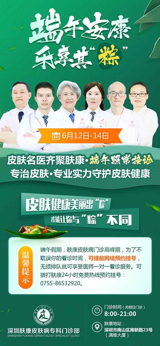 鑒于市民們平日里工作繁忙,通常在假期時間選擇就診治療,本著便民就醫的服務理念。深圳膚康皮膚病專科“端午節”小長假 期間(6.12-6.14)醫生照常接診,滿足廣大患者朋友的假期就診需求。